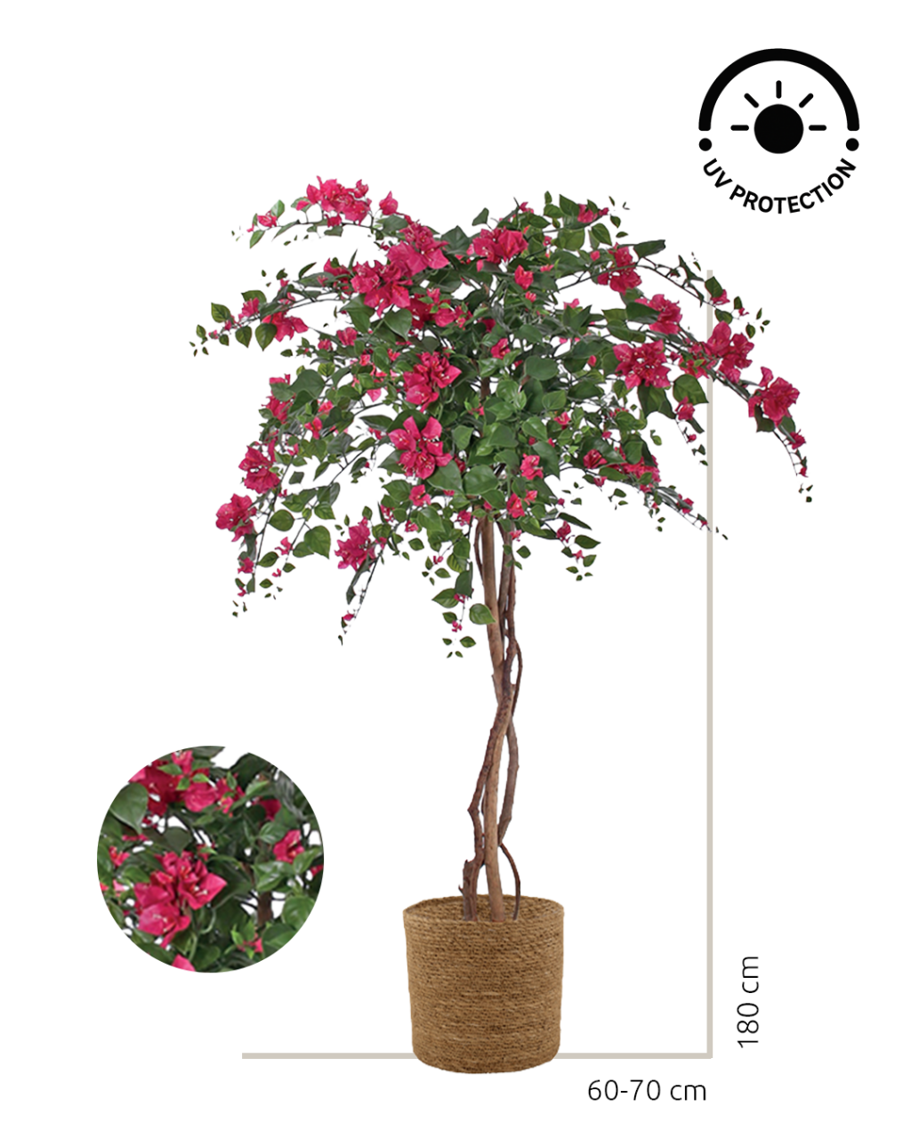 Sus hojas de poliéster y polipropileno ofrecen gran resistencia y un acabado muy realista, sin necesidad de mantenimiento.